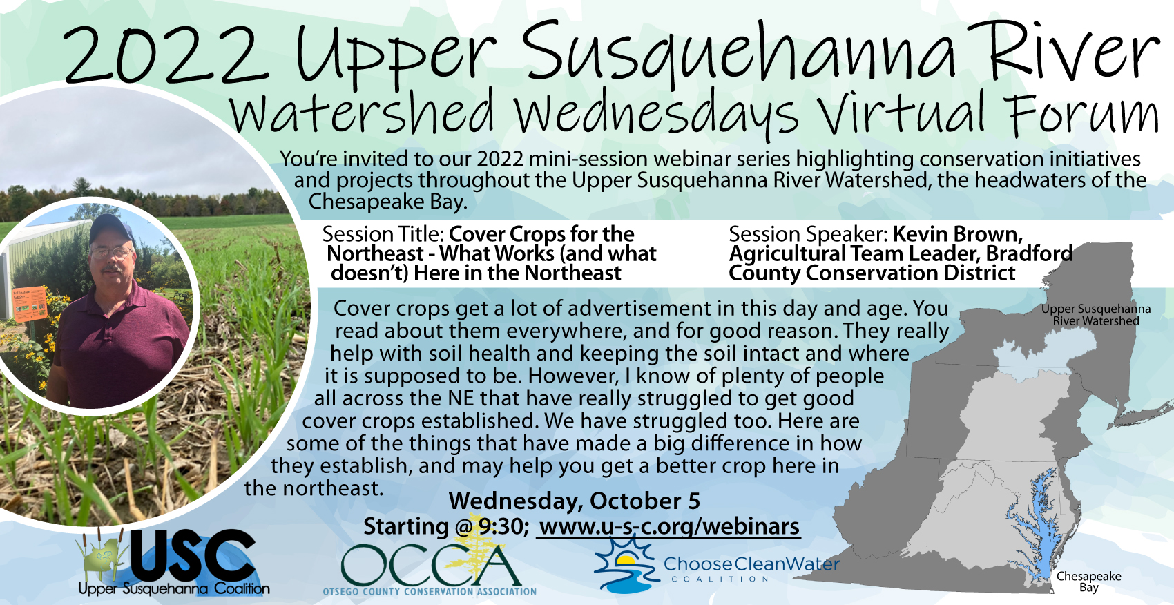 This week’s Watershed Wednesdays topic is cover crops. Cover cropping is probably the most important thing you can do to keep soil and nutrients where they should be, in your field where you can utilize them. However, establishing them in the NE has been challenging. We have operated an inter-seeder for 2 years now and have learned some extremely valuable lessons that will help you in your quest to grow good cover crops. Join us on the 5th to discuss what variables we should be looking at to establish good cover crops.